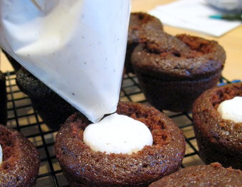 Outra forma um pouco mais sofisticada é colocar o recheio em um saco de confeitar com uma ponta de metal ou plástico, enfiar a ponta no centro do bolo e apertar, colocando o recheio. Este método é rápido, mas tende a deixar pouca quantidade de recheio no bolinho.